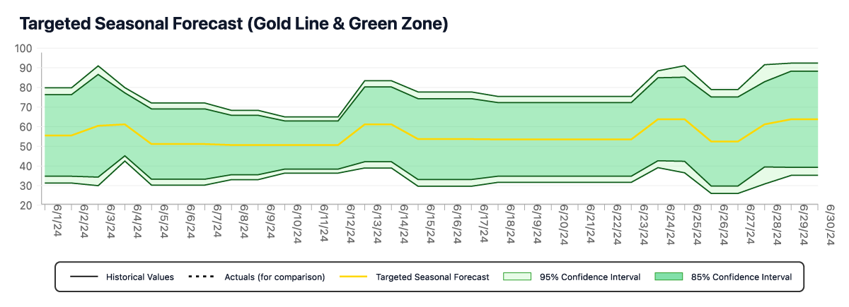 The gold line is the expected daily performance for the month ahead. Each point represents one day’s forecasted sales. The surrounding green zone shows the range of results that are still considered normal — the inner band (85%) for day-to-day operations and the outer band (95%) for high-confidence planning.